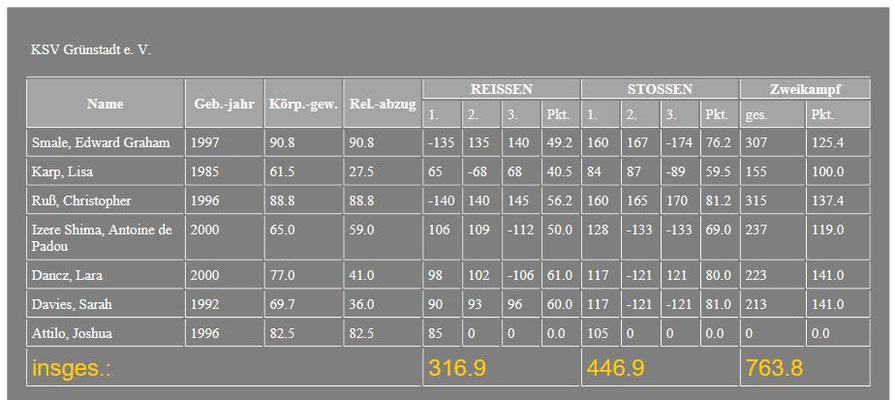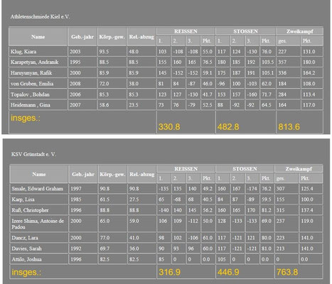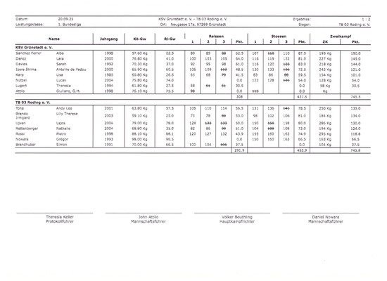 Lucas Nützel: 103 / 127 / 230 (82) - Lisa-Marie Engelmann: 49 / 72 / 121 (68) - Victor Gainza Dauth: 105 / 140 / 245 (64,6) -