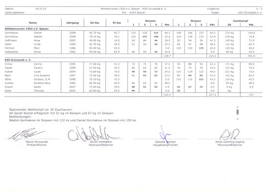 Abteilungsleiter Axel Wenz, der die Begegnung moderierte, geriet beim Verlesen des Gesamtresultates für einen kurzen Moment ins Stocken: „Ich dachte zuerst, das Programm hätte sich vielleicht verrechnet“, bemerkte er lachend. „Aber nein, es stimmt wirklich: Grünstadt hat mit 407,2 zu 209,0 Relativpunkten eindeutig gewonnen.“ Und dies war nicht die einzige Tatsache, die für großen Applaus sorgte - denn gleichzeitig wurde der bisherige Saisonrekord um mehr als 50 Punkte übertroffen. Da auch der AV 03 Speyer II etwas überraschend gegen die als Meister feststehenden Kylltalheber Ehrang siegte, wurde die Tabelle noch einmal kräftig durchgemischt. Während sich Grünstadt vom fünften auf den vierten Rang verbessern konnte, fiel der ersatzgeschwächte KSC 07 Schifferstadt vom dritten auf den letzten Platz zurück. „Wir konnten tatsächlich erst jetzt in optimaler Besetzung antreten“, sagte KSV-Trainer John Attilo. „Wäre das schon früher gelungen, hätten wir nicht bis zum Ende der Runde zittern müssen.“ Am Samstag schafften es zudem nahezu alle der Grünstadter Athletinnen und Athleten, ihre jeweiligen Saisonbestleistungen zu übertreffen; sogar die außer Konkurrenz startende Theresia Keller. Lediglich Vanessa Imrock blieb knapp unter ihrem maximalen Zweikampfergebnis. Da die Wiesbadenerin aber als gesamtbeste Heberin der Veranstaltung hervorging, sollte das nur ein winziger Wermutstropfen sein. Die Brüder Joshua und Giuliano Attilo boten ebenfalls eine starke Vorstellung und lieferten sich wieder ein spannendes internes Duell. Lina Bach und Lucas Nützel überzeugten darüber hinaus mit persönlichen Bestwerten. „Es gab auf unserer Seite auch kaum Fehlversuche, heute hat wirklich fast alles reibungslos geklappt “, ergänzte John Attilo, der sich gemeinsam mit seinen Schützlingen und dem Betreuer-Team Nicole Nützel, Jörg Dancz und Padou Izere Shima über den KSV-Erfolg freute.