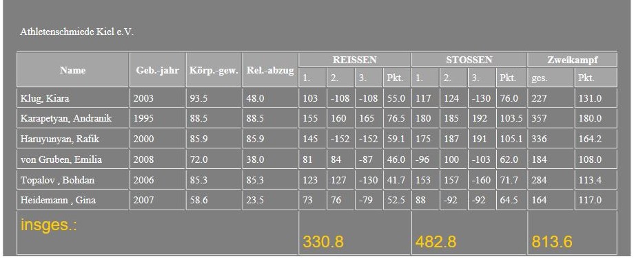 Im Bundesliga-Auswärtskampf bei der Athletenschmiede Kiel musste sich der KSV den erwartet starken Gastgebern zwar mit 763 zu 813 Relativpunkten (0:3) geschlagen geben, stellte aber gleichzeitig einen neuen Vereinsrekord auf. Glückwunsch zu dieser tollen Leistung !